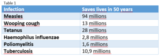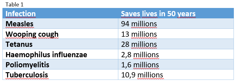 Table 1 shows how many lives vaccinations have saved over the past 50 years, including 94 million lives saved from measles, 13 million from whooping cough, and 28 million from tetanus4.